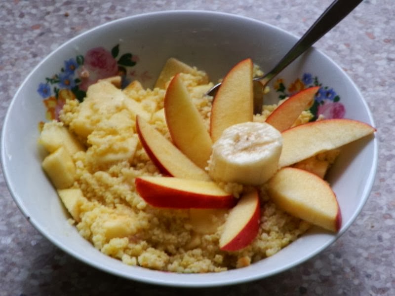 Dzisiaj: kasza jaglana z siemieniem na wodzie i mleku sojowym, z dodatkiem masła orzechowego z Lidla (kupiłam 3 mega słoiki, obym ich nie wykończyła w tydzień!), bananów i cynamonu